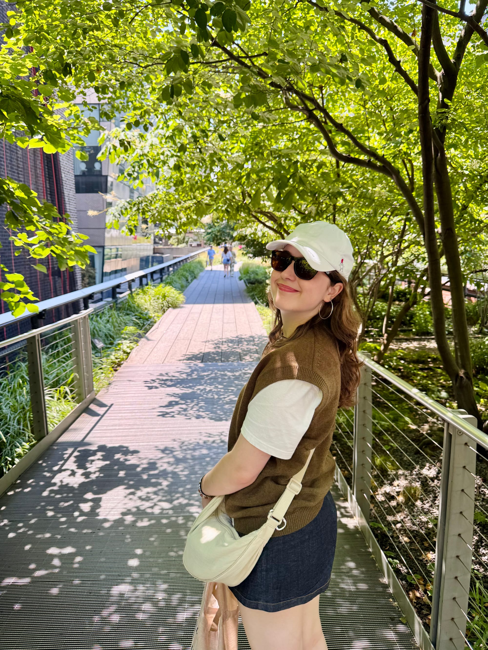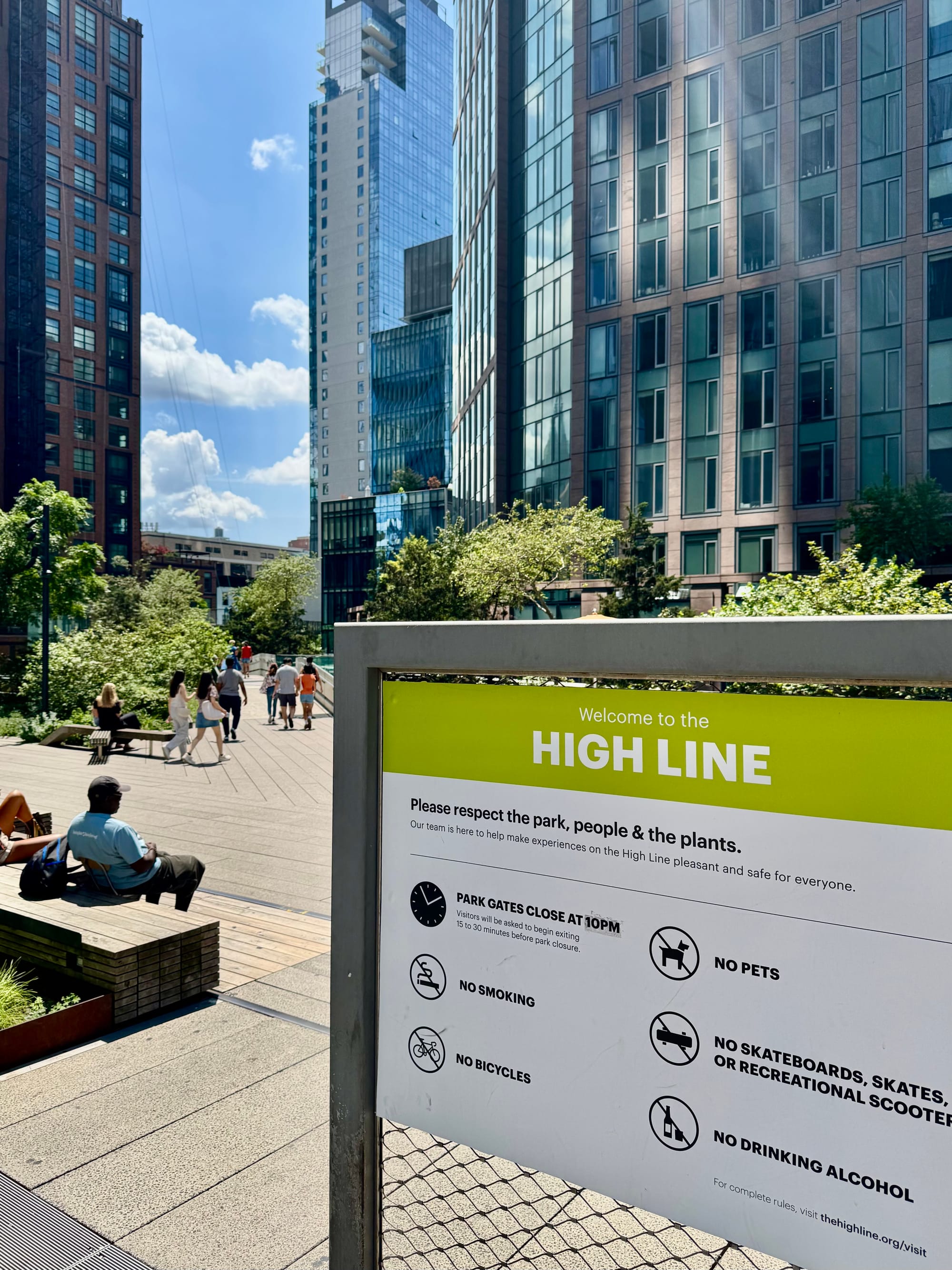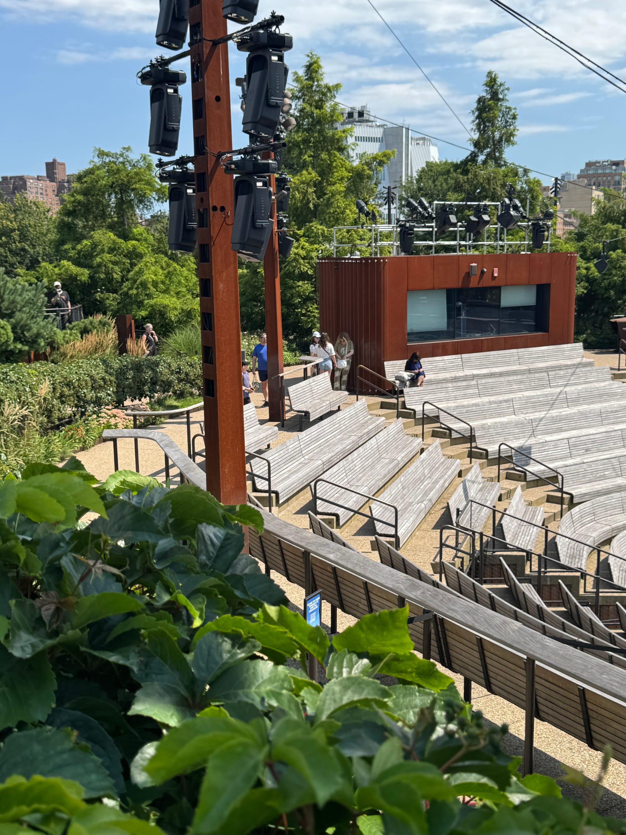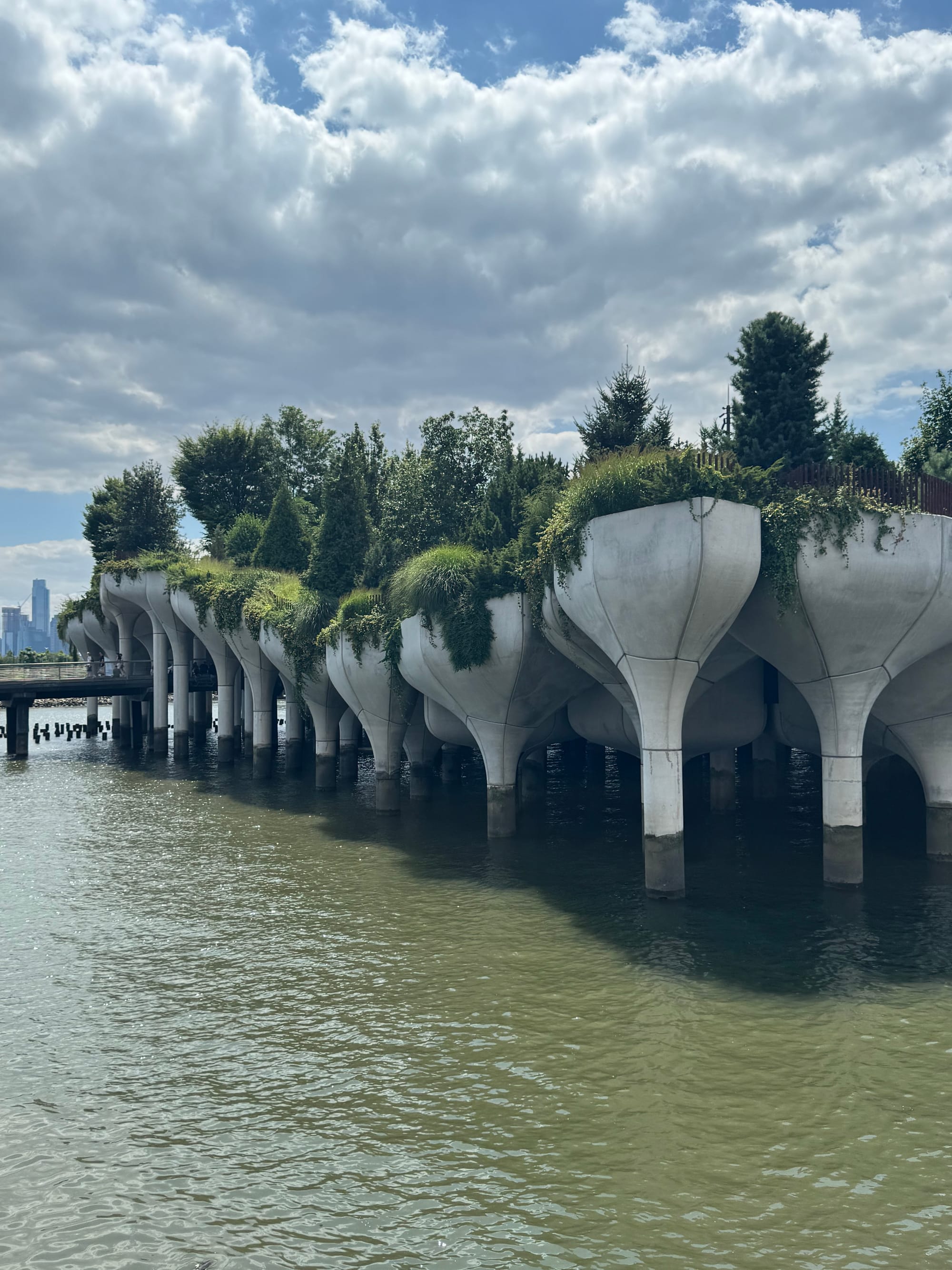 Naar Little Island gelopen (eiland op stelten). Toen sloeg de vermoeidheid/jet leg toe, en reden we met de metro terug naar het hotel. Tegenover het hotel is een klein pleintje met wat groen onderverkeer daar werken we even een snelle snack bij Shake Shack naar binnen. Vervolgens lopen we wederom dezelfde route als vanochtend om naar het theater te lopen voor de voorstelling.