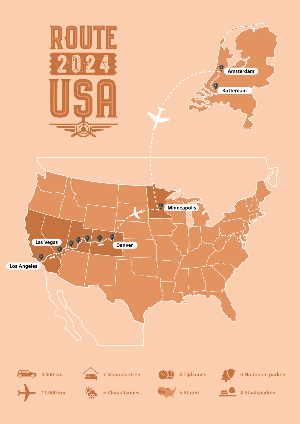 Tijdens de vorige Amerika vakantie heb ik ook een soort naslagwerk gemaakt waarbij ik alle informatie door middel van printjes in insteekbladen kon nalezen. Makkelijk, maar niet echt inspirerend. Een roadbook is meer dan alleen een routebeschrijving. Dit exemplaar moet een hardcover boek worden, die ik wil laten maken door OnlineDrukwerk.nl. Daarin komen mooie foto’s van plaatsen die we willen bezoeken, leuke weetjes, tips die ik van vrienden en medereizigers krijg, en er is zelfs ruimte voor de stickers die we onderweg verzamelen. Uiteindelijk zal het hopelijk een mooi naslagwerk worden.